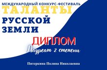 Поздравляем Питеркину Полину и её преподавателя Валиеву Ригину Рифинатовну с победой в Международном конкурсе-фестивале " Таланты русской земли"!