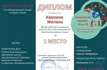 Поздравляем Хамзину Милану и Гизатуллину Камилю Лемаровну с победой ( Лауреат 1 степени) во II международном конкурсе исполнителей на родных языках " Палитра Культур"!