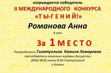 Поздравляем вокалистов- лауреатов Международного конкурса " Ты - гений" Бутылину Евникею (преп. К.Л.Гизатуллина), Абдуллину Аделину (преп. Р.Р.Валиева), лауреата I степени Романову Анну (преп. К.Л.Гизатуллина), лауреата I степени ансамбль кураистов (рук. Н.М.Чалдаева, конц. Л.Р.Шакирова), лауреата III степени Дубровину Екатерину (преп. Р.Р.Валиева)!