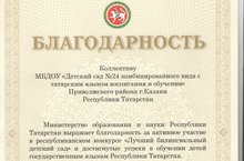 Наш детский сад стал лауреатом конкурса "Лучший билингвальный детский сад" и был награжден благодарственным письмом за активное участие в конкурсе и достигнутые успехи в обучении детей государственным языкам.