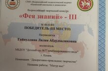 Наша воспитатель младшей группы Гайнуллина Лилия Абдулхаликовна приняла участие во Всероссийском творческом конкурсе «Фея знаний» III и стала победителем,заняв III почетное место.Желаем дальнейших творческих успехов