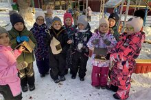 Бакчабызда кунаклар- Кыш бабай һәм Кар кызы. Бүләкләр, җырлар алып килгәннәр.