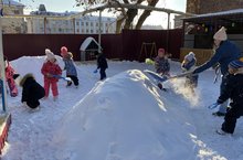 Мы любим кататься на санках, поэтому готовим горку. А заодно, и на участке убрались!