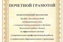 За низкую заболеваемость детей наш сад награждён Почётной грамотой Управления образования г. Казани