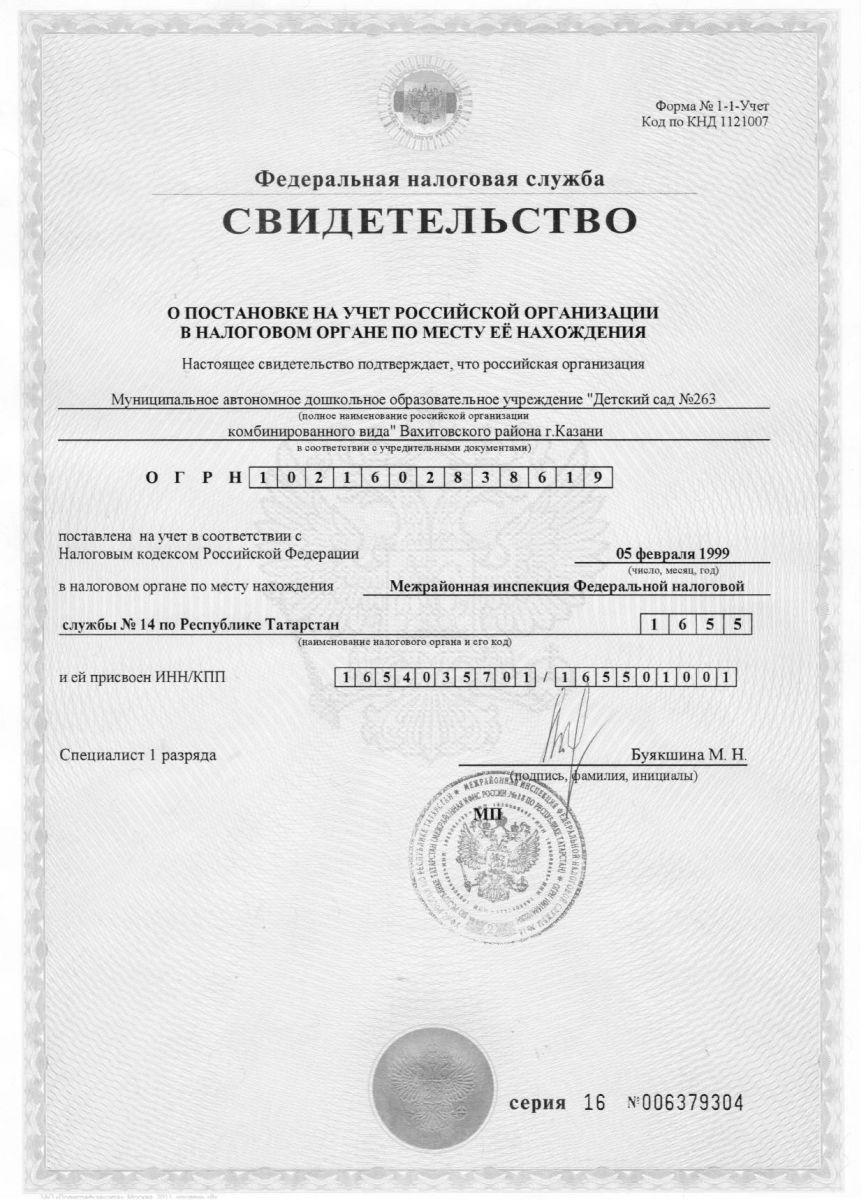 | Муниципальное автономное дошкольное образовательное учреждение "Детский сад № 263 комбинированного вида" Вахитовского района г. Казани | Действует | Приказ от 06.10.2015 № 9827/15-Д |