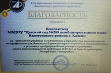 Нашему коллективу была объявлена благодарность за активное участие и содействие в проведении мероприятий по профилактике детского дорожно-транспортного травматизма в условиях предупреждения распространения новой короновирусной инфекции (COVID-19) на территории Республики Татарстан.