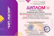 Воспитанники детского сада в составе танцевальной хореографической группы "Родничок" награждены Дипломом Лауреата 3 степени в Международном фестивале- конкурсе "АРТ-Магия". Благодарственными письмами отмечены руководители танцевальной группы. Поздравляем!