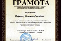 Учитель-логопед Назипова Танзиля Рашидовна награждена грамотой УО ИКМО г.Казани по Вахитовскому и Приволжскому районам за активную деятельность в ПМПК Вахитовского района г.Казани.