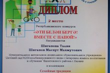 Бакчабызда тәрбияләнүче Шигапова Талия һәм әтисе Масхут Махмутович "ӘТИ БЕЛӘН БЕРГӘ! ВМЕСТЕ С ПАПОЙ!" республика бәйгесендә катнашып 2нче урын дипломга лаек булдылар. Киләчәктә дә әлеге гаиләгә уңышлар телибез! диплом Вместе с папой.docx