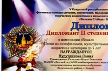 Воспитанница нашего детского сада Нурутдинова Сания - дипломант II степени V Открытого республиканского фестиваля-конкурса детских, юношеских, молодежных творческих коллективов и исполнителей "Великая Победа - 2019"