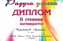 Поздравляем Черепанова А.ученика 1 класса, который получил Диплом II степени во II межрегиональном фестивале "Радуга успеха" в направлении "Радостные краски". Желаем Арсению и Файзуллиной О.С. дальнейших успехов!