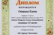 Учащиеся 11 класса Оюшина Елена и Керимова Ламия приняли активное участие в районном этапе VII Республиканского конкурса рисунков «На страже Отечества» и заняли там 3 место. Поздравляем!!!