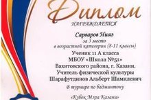 Поздравляем ученика 11 класса Сарварова Нияза, занявшего 3 место в турнире по бадминтону «Кубок Мэра Казани». Молодец!