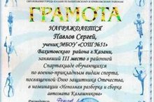 Поздравляем ученика 10 класса Павлова Сергея, занявшего 3 место в районной спартакиаде по военно-прикладным видам спорта в номинации «Неполная разборка и сборка автомата Калашникова», ученика 10 класса Валеева Эрнеста, занявшего 2 место в районной спартакиаде по военно-прикладным видам спорта в номинации «Подъем гири» и преподавателя ОБЖ Федорова А.А., подготовившего ребят. Молодцы!!!
