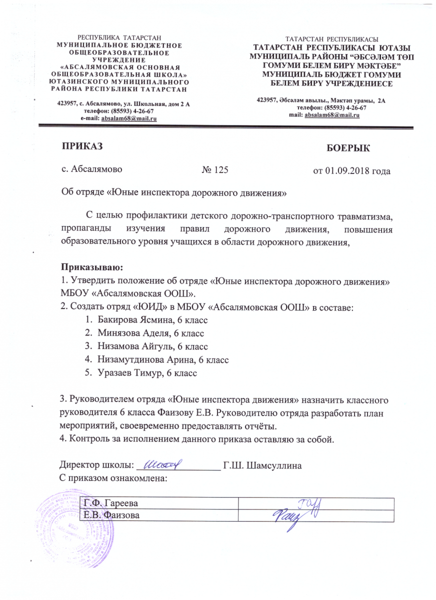 Приказ о создании оиряда "ЮИД" на 2018-2019 учебный год