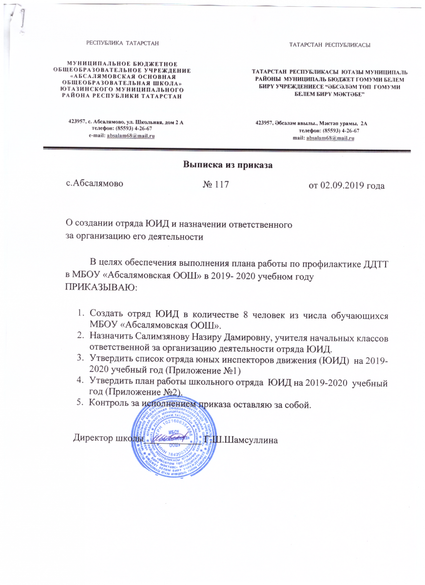 Приказ о создании отряда "ЮИД" на 2019-2020 учебный год
