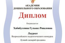 Воспитательница Хабибуллина Г.Р. стала лауреатом Всероссийского педагогического конкурса «Лучший сценарии праздника» и награждена Дипломом.