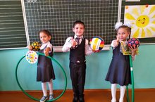 1 сыйныф укучыларына, яңа уку елы белән котлап, мәктәпне 40 ел элек тәмамлаган укучылар исеменнән спорт җиһазлары тапшырылды.