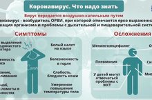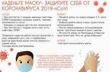 Симптомы заболевания новой коронавирусной инфекции (COVID-19) сходны с симптомами обычного (сезонного) гриппа:• высокая температура тела• головная боль• слабость• кашель• затрудненное дыхание• боли в мышцах• тошнота• рвота• диарея7 шагов по профилактике коронавирусной инфекции.1. Воздержитесь от посещения общественных мест: торговых центров, спортивных изрелищных мероприятий, транспорта в час пик;2. Используйте одноразовую медицинскую маску (респиратор) в общественных местах, меняяее каждые 2-3 часа.3. Избегайте близких контактов и пребывания в одном помещении с людьми, имеющимивидимые признаки ОРВИ (кашель, чихание, выделения из носа).4. Мойте р уки с мылом и водой тщательно после возвращения с улицы, контактов спосторонними людьми.5. Дезинфицируйте гаджеты, оргтехнику и поверхности, к которым прикасаетесь.6. Ограничьте по возможности при приветствии тесные объятия и рукопожатия.7. Пользуйтесь только индивидуальными предметами личной гигиены (полотенце, зубнаящетка)5 правил при подозрении на коронавирусную инфекцию: