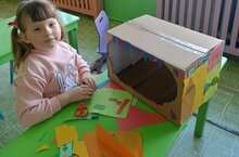 Вот, так из обычной картонной коробки наша воспитаница смастелила яркий, уютный дом для своего котика.