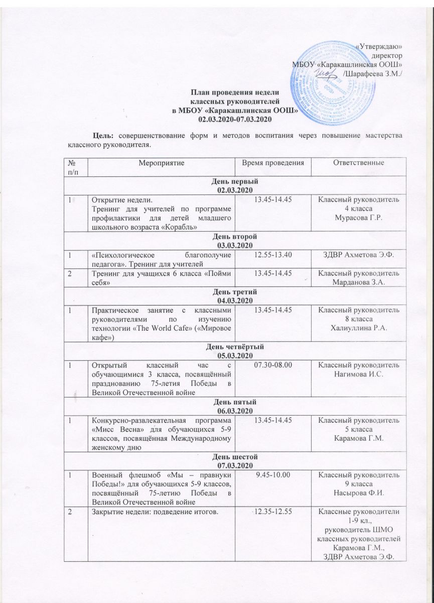 План проведения недели классных руководителей/ Сыйныф җитәкчеләре атналыгын үткәрү планы 29.02.2020