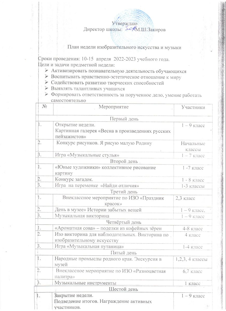 План недели изобразительного искусства и музыки/ Рәсем сәнгате һәм музыка атналыгы планы 10.04.2023