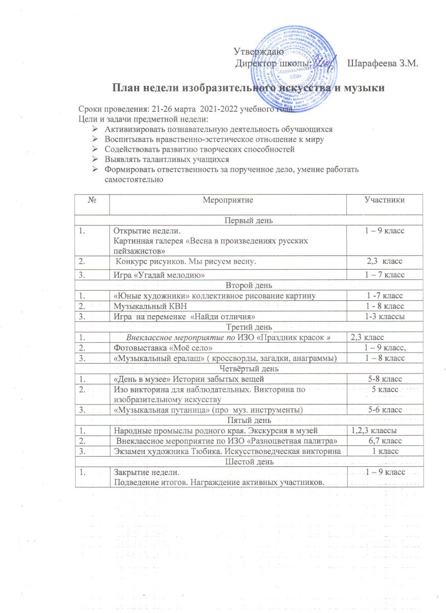 План недели изобразительного искусства и музыки/ Сынлы сәнгать һәм музыка атналыгы планы 21.03.2022