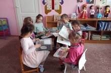 Просмотр книг на уголке библиотеки. / Китапханә почмагында китаплар карау.
