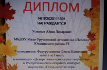 Наш воспитанник Усманов Айваз участвовал в Республиканском открытом конкурсе творчества «Осень-золотая пора» и в номинации «Декоративно-прикладное творчество» занял I место.