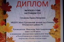 Наш воспитанница Ситдикова Карина участвовала в Республиканском открытом конкурсе творчества «Осень-золотая пора» и в номинации «Декоративно-прикладное творчество» заняла 3 место.