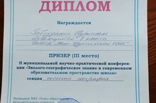26 марта прошла муниципальная научно-практическая конференция "Эколого-географическое знание в современном образовательном пространстве школы". Нашу школу представлял ученик 8 класса Габидуллин Нурислам (руководитель Габидуллина З.И.), который стал призером этой конференции. Поздравляем Нурислама и Зилию Илгизаровну!