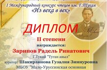 Поздравляем Зарипова Раделя, ученика 4 класса МБОУ "Мало-Уруссинская ООШ" победой в I Международном конкурсе чтецов имени Г. Тукая "Из века в век". Желаем дальнейших побед!