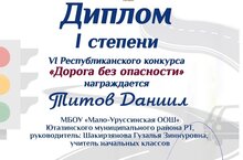 Ученик 3 класса МБОУ"Мало-Уруссинская ООШ" Титов Даниил награждён Дипломом 1 степени VI Республиканского конкурса "Дорога без опасности". Поздравляем и желаем дальнейших побед!