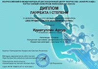 Поздравляем учащегося Уруссинской ДШИ Идиатуллина Артура с победой в онлайн-конкурсе IV Всероссийского музыкального конкурса "Инструментальное исполнительство", занявшего Лауреата 1 степени. Преподаватель Мударисова Светлана Назиповна награждена дипломом.