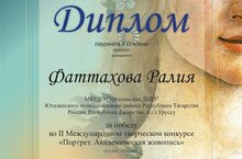 Портрет – это один из главных жанров живописи, скульптуры, графики, его смысл именно в том, чтобы воспроизвести индивидуальные качества конкретного человека и один из самых выразительных средств интерпретации личности. Название этого жанра происходит от старофранцузского выражения, означающего "воспроизводить что-либо черта в черту". Диплом лауреата 2 степени получила ученица 1 класса художественного отделения Фаттахова Ралия, которая приняла участие во II Международном творческом конкурсе «Портрет. Академическая живопись». Поздравляем юную художницу Ралию и преподавателя Ибрагимову Альбину Камильевну с отличным результатом и желаем в дальнейшем творческих побед!