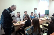 Юные художники просматривали репродукции картин художника, слушали его рассказы о работе и творчестве, задавали вопросы. Беседа проходила за чайным столом, а после чаепития ребята подарили своему преподавателю неожиданно трогательные подарки, выполненные своими руками.