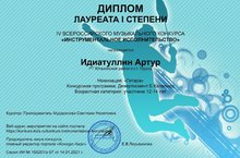 Поздравляем учащегося Уруссинской ДШИ Идиатуллина Артура с победой в онлайн-конкурсе IV Всероссийского музыкального конкурса "Инструментальное исполнительство", занявшего Лауреата 1 степени. Преподаватель Мударисова Светлана Назиповна награждена дипломом