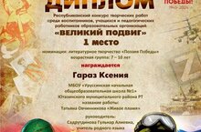 Поздравляем ученицу 3А класса #УруссинскаяНОШ1 Гараз Ксению занявшую 1 место в Республиканском творческом конкурсе "Великий подвиг". Желаем дальнейших успехов!