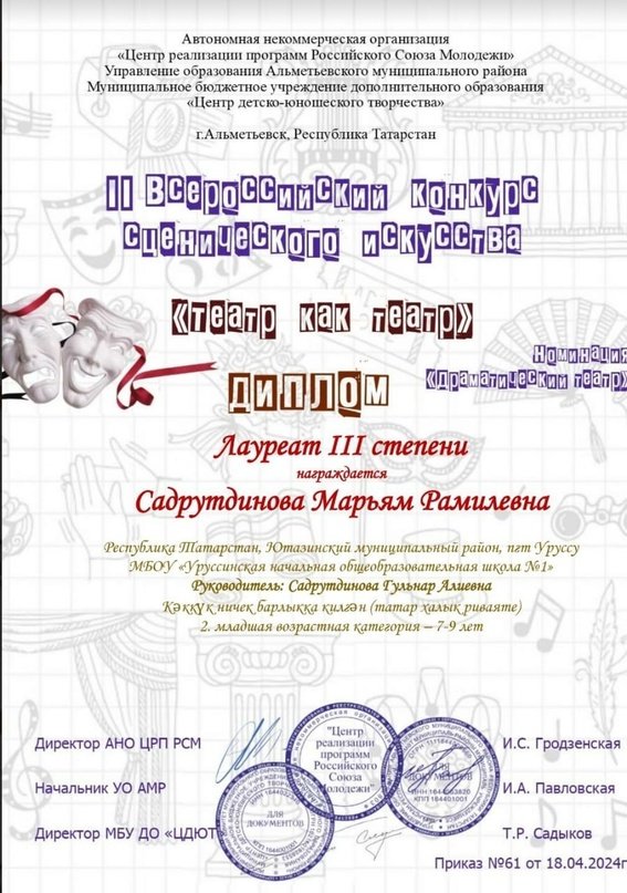 Поздравляем коллектив школьного театра "Салават купере"(руководитель Садрутдинова Г.А.) и отдельных членов коллектива Садрутдинову Марьям и Гараз Ксению, лауреатов и дипломантов II Всероссийского конкурса сценического искусства "Театр как театр".
