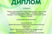 Учащиеся 2 В класса Гараев Вильдан и Гимадиева Азалия заняли 1 место в VII Республиканском конкурсе "Тукай безнең күңелләрдә" - "Тукай в наших сердцах" ( рук. - Садрутдинова Г.А.)