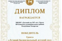 В сентябре 2019 года наш детский сад принял участие в республиканском конкурсе "Лучший билингвальный детский сад". В конкурсном отборе приняли участие 55 детских садов Республики Татарстан, 28 лучших стали обладателями гранта в размере 500 тысяч рублей. По итогам конкурса наш детский сад вошёл в двадцатку лучших детских садов Республики Татарстан по обучению детей татарскому языку и выиграл грант 500000 рублей. На средства гранта была обновлена предметно-развивающая среда детского сада. Было преобретено интерактивное оборудование, игрушки, детская мебель, которые используются в работе./2019 елның сентябрендә безнең балалар бакчасы "Иң яхшы билингваль балалар бакчасы"республика конкурсында катнашты. Конкурс сайлап алуында Татарстан Республикасының 55 балалар бакчасы катнашты, 28 иң яхшысы 500 мең сум күләмендә грантка ия булды. Конкурс нәтиҗәләре буенча безнең балалар бакчасы татар телен өйрәтү буенча Татарстан Республикасының иң яхшы 20 балалар бакчасы исемлегенә керде һәм 500000 сум грант отты. Грант акчасына балалар бакчасының фән-үсеш мохите яңартылды. Интерактив җиһазлар, уенчыклар, балалар җиһазлары сатып алынды.
