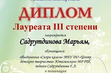 Обучающаяся объединения дополнительного образования "Юные музееведы" (руководитель Ямалетдинов А. А. ) Галлямова Аделина награждена Дипломом за активное участие в Х ll Республиканском конкурсе научно-исследовательских, проектных и творческих работ учащихся 1-9 классов "Я выбираю село". 06.04.2022