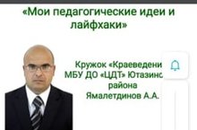 Педагог дополнительного образования Ямалетдинов А. А принимает участие в Межрегиональном конкурсе авторских методических идей и приёмов в сфере образования, воспитания и развития детей"Мои педагогические идеи и лайфхаки". Им для участия в конкурсе направлен авторский материал по организации сотрудничества детей в решении учебной задачи в рамках кружка"Краеведение". 12.02.2020