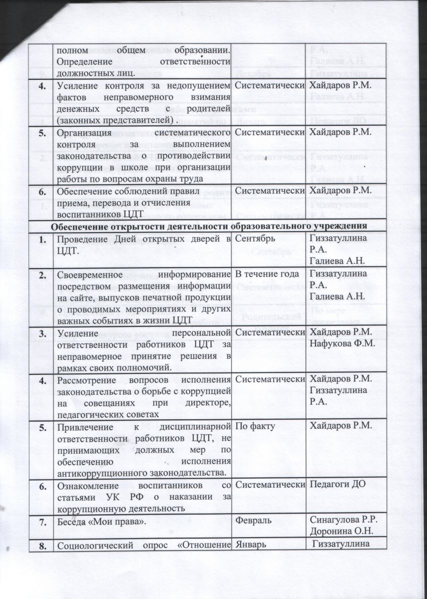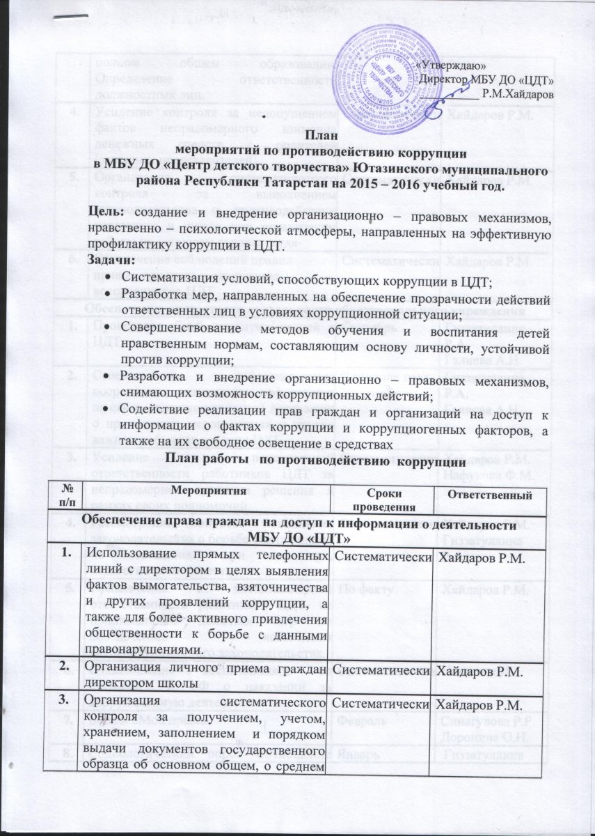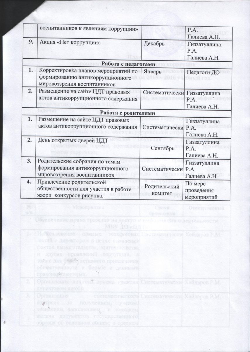 План мероприятий по противодействию коррупции в МБУ ДО "ЦДТ" на 2015-2016 учебный год