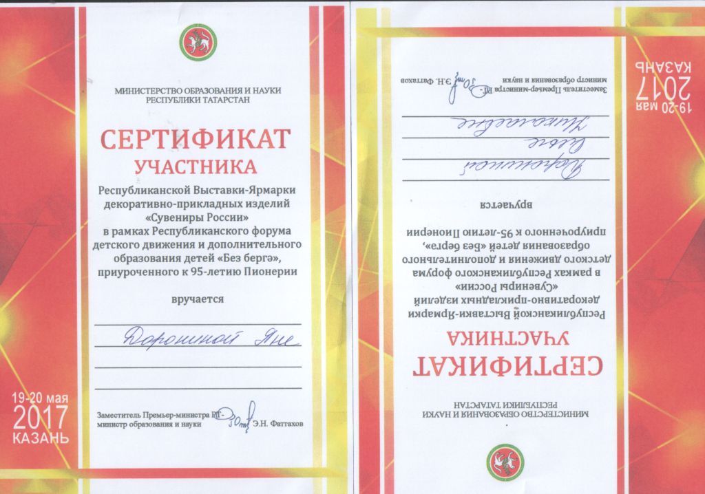 /Сертификат участника на Республиканской Выставки - Ярмарки декоративно - прикладных изделий "Сувениры России".Доронина Ольга. jpg