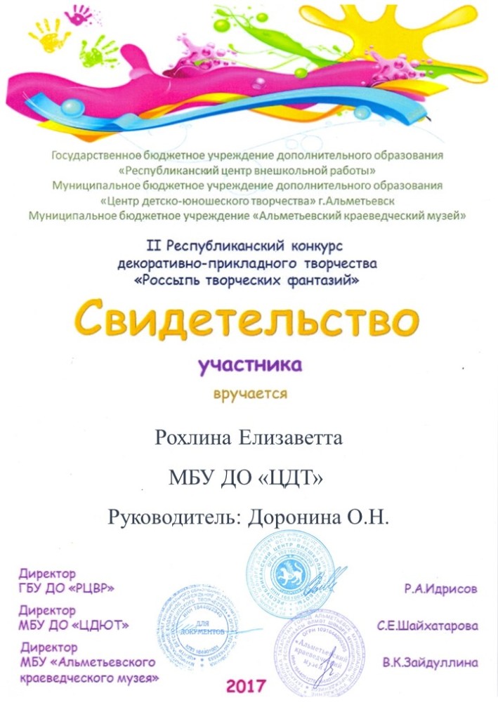 /Свидетельство участинка Республиканском конкурсе декоративно - прикладного творчества "Россыпь творческих фантазий". Рохлина Елизаветта.jpg