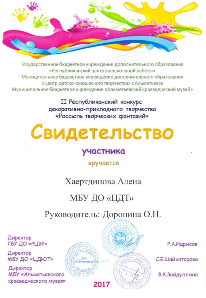 /Свидетельство участника Республиканском конкурсе декоративно - прикладного творчества "Росыпь творческих фантазий". Хаертдинова Алена.jpg
