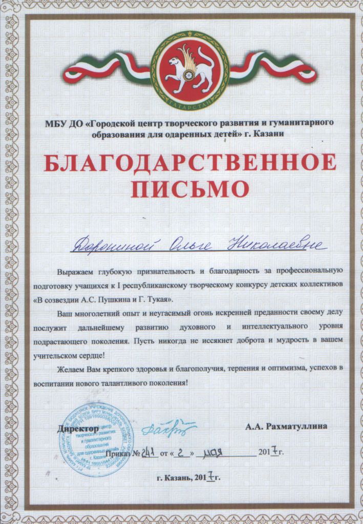 /Благодарственное письмо МБУ ДО "Городской центр творческого развития и гуманитарного образования для одаренных детей" г. Казани.jpg