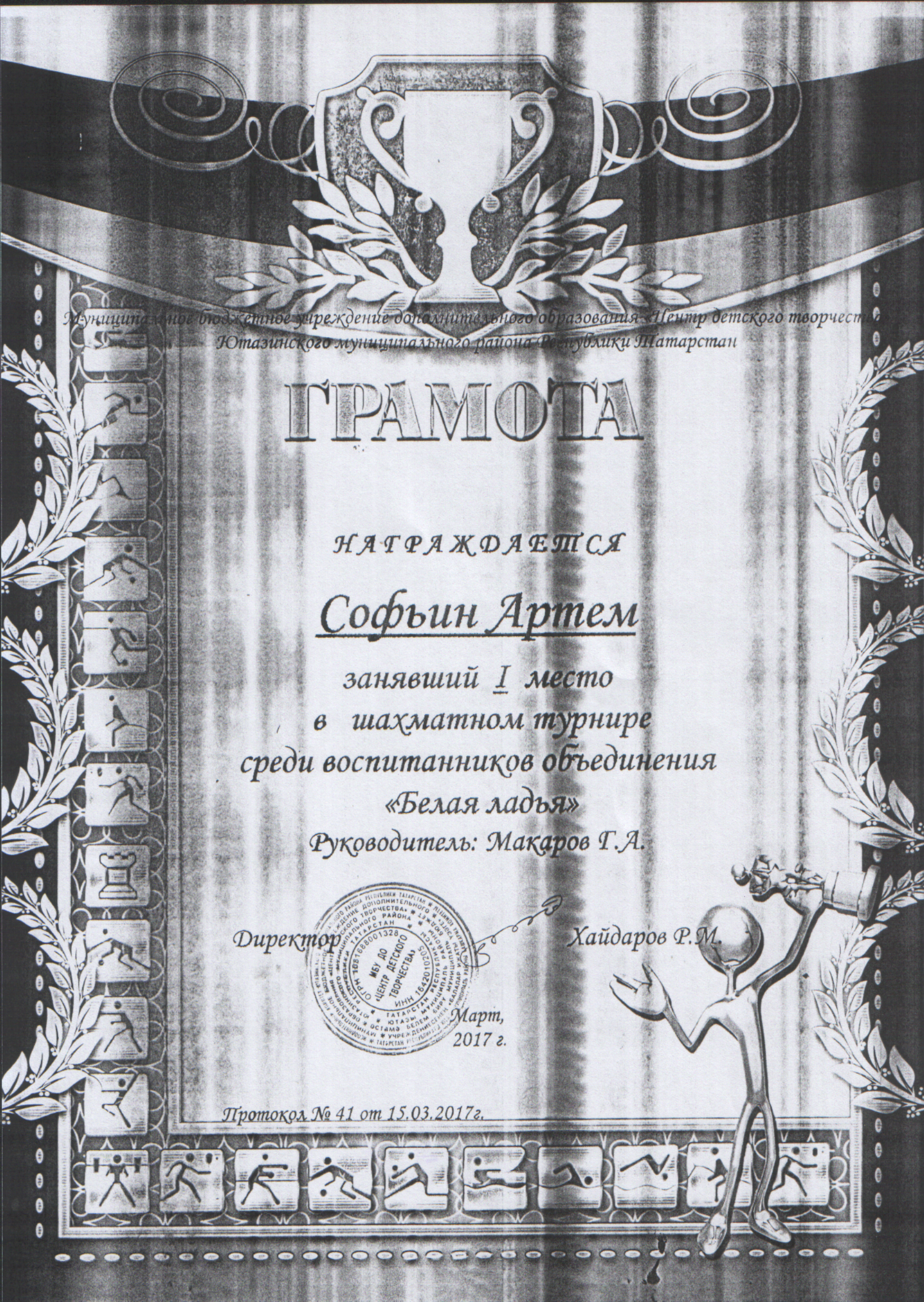 /Грамота в шахматном турнире среди воспитанников ЦДТ. Софьин Артем.bmp