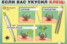 Что делать, если клещ все-таки укусил.Даже если клещ кого-то укусит - это еще вовсе не значит, что человек заболеет энцефалитом. Человек заболевает от клещей, которые сами являются зараженными энцефалитом. Прежде всего клеща надо вытащить. Имейте в виду, что чем дольше клещ сидит, тем труднее его вытащить - еще один аргумент в пользу регулярных осмотров. Обычно он впивается в места, где нежная кожа, но бывает наоборот. Так что будьте внимательны , если клещ впился в неклассическом месте - там, где кожа толстая; в этом случае он сразу "вгрызается" очень глубоко и вытащить его гораздо труднее. Классический способ извлечения - охватить клеща нитяной петлей и капнуть вазелина (солидол, ЦИАТИМ, любой другой ГСМ средней густоты) так, чтобы клещ был полностью закрыт. Минут через 5 начать периодические потягивания за нитку - с должным терпением и без фанатизма. Постепенно клещ будет извлечен (может занять минут 15-20, будьте к этому готовы). Если присосавшаяся особь еще не успела напиться крови или это малюсенькая личинка, то избавиться от нее можно с помощью капли растительного масла, которую нужно капнуть на место укуса, перекрыв, таким образом, клещу поступление кислорода. Вместо масла можно взять крем, вазелин или даже керосин. Само насекомое, но только в том случае, если оно живое, желательно отнести в больницу для исследования на наличие инфекции. Для этого его нужно посадить в банку с влажной ваткой или несколькими травинками. Место укуса клеща нужно обязательно продезинфицировать, а руки тщательно вымыть с мылом. Конечно, обнаружив на себе или своем близком присосавшегося паразита, лучше всего сразу же обратиться к врачу.Если же такой возможности нет, то клеща нужно удалять следующим образом: возьмитесь за клеща ровно под прямым углом, не сгибая его, и поверните, как бы выворачивая по часовой стрелке.Если вы все же порвали клеща или же клещ впился так, что не уцепишься - относитесь к нему как к занозе: стерилизуйте иголку (хоть на спичке), и вперед.Всю процедуру лучше выполнять в тонких перчатках или с помощью носового платка, так как яд из раздавленного насекомого может попасть в организм человека даже непосредственно через кожу.КЛЕЩЕВОЙ ЭНЦЕФАЛИТ